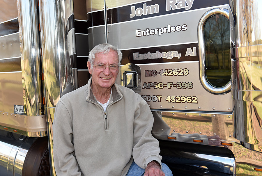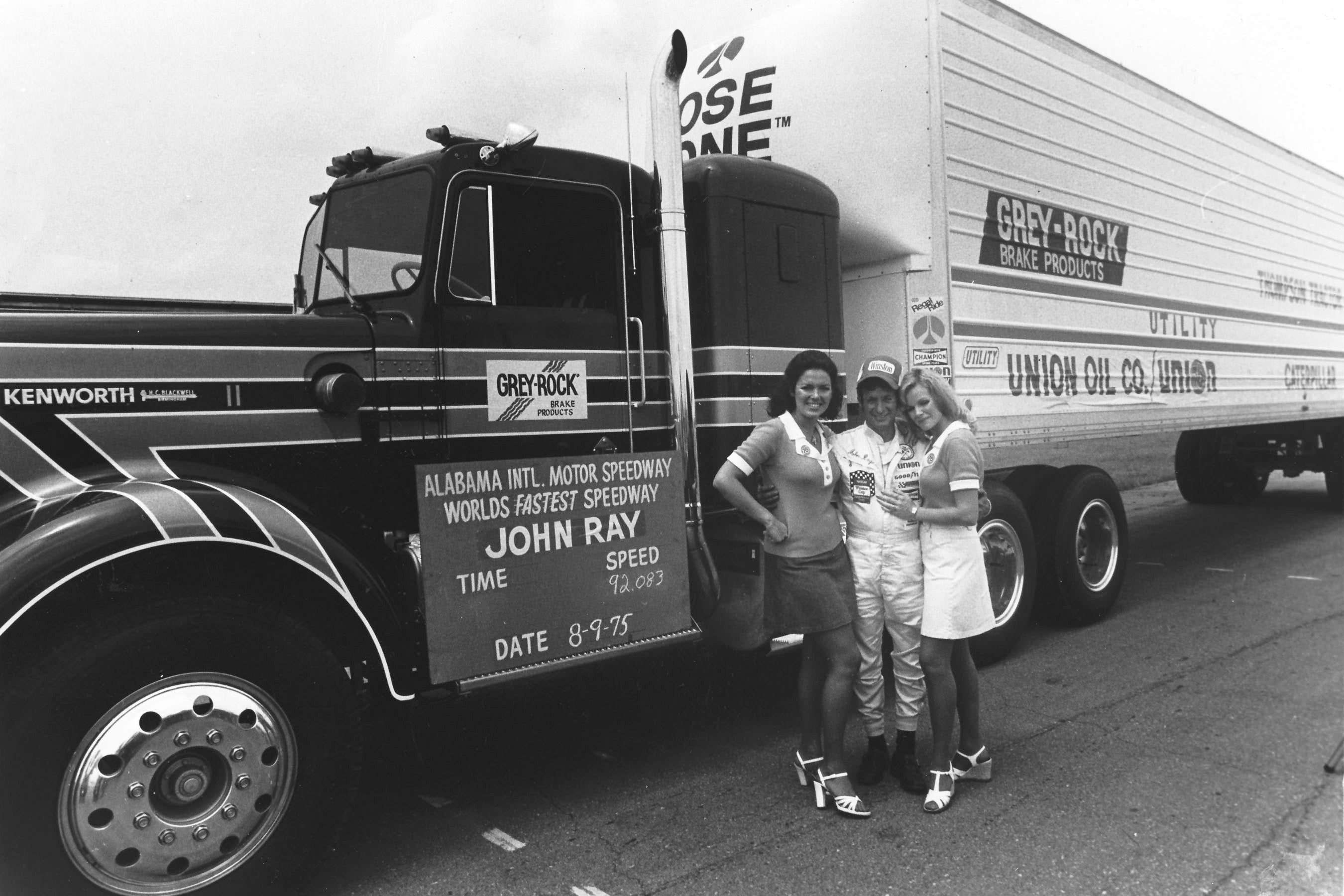 Ray, who owned “John Ray Trucking Company” since the early 70’s, set the world speed record for a semi-truck and trailer around the mammoth Talladega Superspeedway at 92.083 mph in 1975 – in a powerful Kenworth diesel that hissed and hummed through the tri-oval at a break-neck speed one fall afternoon.